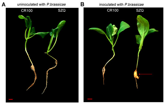 Figure 1. Phenotypes of pakchoi without (A) and with (B) P. brassicae inoculation for 30 days. SZQ represents Suzhouqing, a susceptible pakchoi; CR100, a resistant pakchoi. Scale bars = 1 cm. The red arrow indicates the “clubroot” of SZQ.