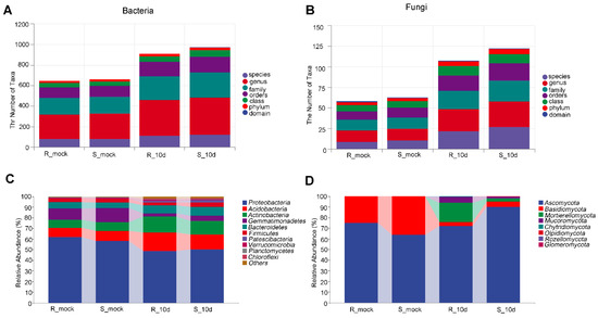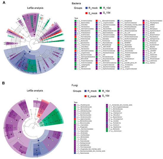 To further identify the notable different taxa, the LefSe analysis of rhizosphere bacterial communities displayed that there were 107 differentially abundant taxa in the samples of R_mock, S_mock, R_10d, and S_10d, with values of 19, 9, 25, and 54, respectively (Figure 6A). The most abundant taxa in R_mock was Rhodanobacteraceae, in S_mock R_10d it was Gemmatimonadetes, in R_10d it was Betaproteobacteriales, and in S_10d it was Bacteroidetes (Figure S2). The LefSe analysis of fungal communities showed that there were 39 differentially abundant taxa in the samples of R_mock, S_mock, R_10d, and S_10d, with values of 4, 1, 11, and 33, respectively (Figure 6B). The most abundant taxa in R_mock was Hypocreaceae, in S_mock it was Agaricomycetes, in R_10d it was Mortierellomycota, and in S_10d it was Eurotiomycetes (Figure S3).