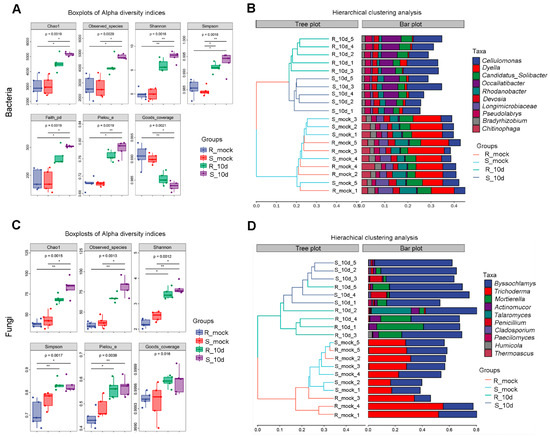 Figure 3. Microbial diversity analysis in bacteria and fungi. (A,B) Alpha diversity (A) and clustering analysis at genus levels (B) in bacteria. (C,D) Alpha diversity (C) and clustering analysis at genus levels of the top 10 taxa with the most abundance (D) in fungi. * p < 0.05, ** p < 0.01 (Dunn’s test).