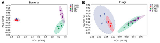 A principal coordinates analysis (PCoA) plot showed that rhizosphere samples of R_mock and S_mock were indistinguishable, while samples of R_10d and S_10d were significantly separated for bacteria (Figure 4A). For fungi, R_mock and S_mock samples were separated, while R_10d and S_10d samples were indistinguishable (Figure 4B). However, the PCoA plot distinguished the soil samples inoculated with P. brassicae from uninoculated soil samples both for bacteria and fungi.