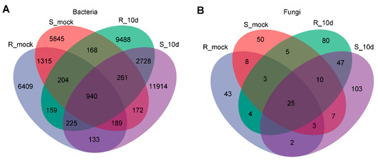 To further understand the microbial community, the ASV among different groups was calculated. In total, we obtained 40,150 bacterial ASVs and 390 fungal ASVs (Figure 5). S_mock and R_mock shared 2648 and 39 bacterial and fungal ASVs, respectively, while R_10d and S_10d shared 4154 and 82 ASVs, respectively (Figure 5A,B). The unique bacterial ASVs in R_mock, S_mock, R_10d, and S_10d were 6409, 5845, 9488, and 11,914, respectively, and fungal ASVs were 43, 50, 80, and 103, respectively (Figure 5A,B). Here, it was noticed that the number of both bacteria and fungi ASVs increased significantly in the inoculation groups compared to the uninoculated groups. Moreover, between the two inoculated groups, ASVs in the S_10d group were much higher than those in R_10d, indicating that microorganisms might be more likely to cluster around the susceptible cultivar rhizosphere.