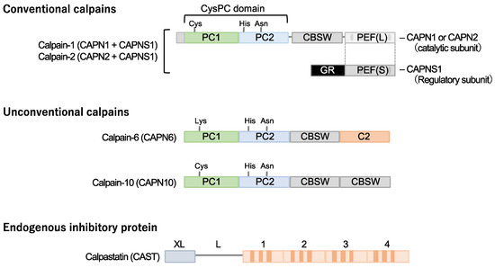 Cardiometabolic calpains. Calpains are a superfamily of cysteine proteases with a CysPc domain. Two types of conventional isozymes and two types of unconventional calpains are thought to be involved in cardiometabolic diseases. Conventional calpains are formed when the subtype-specific catalytic subunits calpain-1 and calpain-2 form heterodimers with the common regulatory subunit, calpain-s1, respectively. On the other hand, no quaternary structure has been identified for calpain-6 and calpain-10, which are unconventional isoforms. Calpastatin is known as a specific endogenous inhibitor, and its increased expression in cells may downregulate the activity of conventional isozyme and calpain-10. Notably, a cysteine residue in the active core of calpain-6 is substituted with lysine and is thought to lack protease activity. CBSW, calpain-type β-sandwich domain; CysPc, cysteine protease domain, calpain-type; GR, glycine-rich domain; PC, protease core; PEF, penta-EF-hand domain.