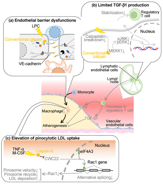 Lymphatic vessels exert a pivotal role in the regulation of fluid homeostasis, the conveyance of immune cells, and the transportation of lipids absorbed from dietary sources [60]. Recent studies have revealed that dysfunctional lymphatic vessels contribute significantly to the pathogenesis and progression of atherosclerosis within major arterial conduits. Notably, lymphatic dysfunction exacerbates dyslipidemia through its propensity to diminish the conveyance of cholesterol from the periphery to the hepatic locus, a phenomenon recognized as reverse cholesterol transport [61]. Furthermore, earlier investigations have ascertained the existence of micro-lymphatic vessels within the adventitia of atherosclerotic plaques, which participate in reverse cholesterol transport and the withdrawal of lymphocytes from the interior plaques [62,63,64]. As lysophospholipids can potentiate conventional calpains, we comprehensively assessed phospholipid composition in a murine model of dyslipidemia by using lipidomic analysis, indicating an augmentation in certain lysophospholipids, including lysophosphatidic acid, within the lymphatic microenvironment [65]. Upon the introduction of these lysophospholipids into cultured lymphatic endothelial cells, the activation of the conventional calpains was ascertained. Furthermore, when lymphocytes isolated from the murine spleen were co-cultured with lymphatic endothelial cells, leading to an evaluation of lymphocyte stability, it was observed that regulatory T cells were stabilized when lysophosphatidic acid was introduced concomitantly with the downregulation of calpain [65]. Upon assessing the expression of factors responsible for stabilizing regulatory T cells within lymphatic endothelial cells, a substantial elevation in TGF-β1 expression was evident, which was further augmented by the concurrent addition of lysophosphatidic acid and the inhibition of calpain. This is attributed to the calpain-induced proteolytic degradation of mitogen-activated protein kinase kinase kinase 1 (MEKK1), a constituent of the TGF-β1 biosynthesis pathway. The supplementation of a TGF-β1 receptor inhibitor in the aforementioned co-culture system canceled the protective influence on regulatory T cells, underscoring the attribution of TGF-β1 derived from lymphatic endothelial cells to this protective effect [65]. Targeting conventional calpains, specifically in lymphatic endothelial cells and myeloid cells, in a murine model of dyslipidemia induced by a high-cholesterol diet, resulted in the suppression of atherosclerosis in the aorta and an elevation in circulating levels of TGF-β1 and regulatory T cell counts [65]. Conversely, lipoprotein cholesterol remained unaffected, suggesting minimal involvement in the reverse cholesterol transport. Pathophysiologic analysis of atherosclerotic lesions revealed a substantial reduction in pro-inflammatory M1-type macrophages due to calpain deficiency, alongside increased expression of immunosuppressive cytokines such as IL-10 and TGF-β1 [65]. These observations predominantly owed to conventional calpains in lymphatic endothelial cells, as they were not replicated in bone marrow chimeric mice solely deficient in calpain in bone marrow cells. In contrast, the administration of TGF-β1 receptor inhibitors nullified the anti-atherosclerotic and regulatory T cell-stabilizing effects observed in lymphatic endothelial cell/myeloid cell-specific calpain-deficient mice, strongly implicating TGF-β1 signaling in these phenomena.