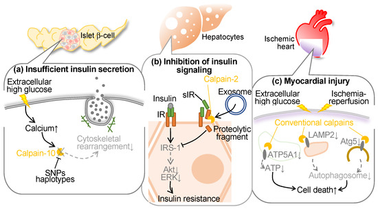 Conventional calpains have been reported to be activated in hyperglycemia to blunt endothelial cells, hepatocytes, and pancreatic β cells (Figure 3). In the initial years of the 21st century, polymorphism of the CAPN10 (calpain-10 gene) was reported to increase the risks of type 2 diabetes and decrease glucose disposal. Indeed, the G allele of the single nucleotide polymorphism (SNP)-43 has shown associations with insulin resistance [80] and the onset of type 2 diabetes in both cross-sectional [32] and prospective studies [81]. While other investigations have failed to establish a correlation between the G allele and type 2 diabetes or insulin resistance [82,83,84], additional SNPs and/or haplotypes within the corresponding locus have been identified to possess greater significance in glucose metabolism [82,85,86]. Furthermore, variations in this genetic locus might govern insulin secretion [87]. In addition, recent studies have identified that hyperglycemia-induced conventional calpains contribute to myocyte injury in the ischemic heart.