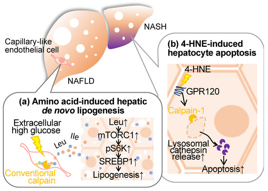 Conventional calpains contribute to liver disease. (a) In the capillary-like endothelial cells found in parenchyma in NAFLD liver, conventional calpains are over-activated and execute excessive proteolysis resulting in an increase of amino acids, including leucine, in the liver microenvironment. This increase in amino acids promotes de novo lipogenesis in the surrounding hepatocytes and accelerates the formation of fatty liver. (b) the oxidative adduct 4-HNE activates hepatocyte calpain in NASH via GPR120, which permeabilizes the lysosomal membrane and increases cytosolic cathepsins. As a result, hepatocytes are thought to undergo cell death. GPR120: G-protein coupled receptor 120; 4-HNE: 4-Hydroxynonenal; mTORC1: mammalian target of rapamycin complex 1; NAFLD: non-alcoholic fatty liver disease; NASH: non-alcoholic steatohepatitis; SREBP1: sterol regulatory element-binding protein 1; S6K: ribosomal protein S6 kinase B1.
