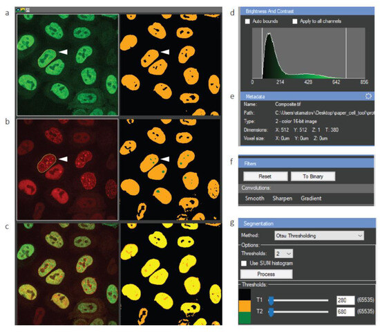 Tracking cell nuclei from a large field of view in CellTool. (a–c) Display of the raw data (left) and processed image (right). White arrowheads denote a cell of interest tracked over time; (a) GFP channel; (b) mCherry channel; (c) merged; (d) brightness and contrast settings of the raw image; (e) metadata, which can be edited (adjustment wheel in the top right corner); (f) image filters panel; (g) segmentation panel with a number of adjustable parameters.