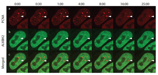 Selected frames from a time-lapse movie of ALKBH2 and PCNA after UV micro-irradiation. (a) PCNA-mCherry; (b) ALKBH2-EGFP; (c) merged. White arrowheads indicate the micro-IR site. The shown S-phase cell exhibited a number of PCNA replication foci. Following micro-IR, these foci dissolved due to checkpoint activation.