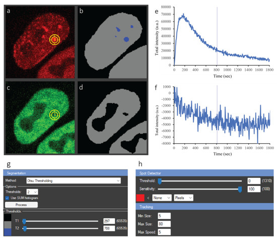 First, Gaussian smoothing was performed to facilitate segmentation of the foci. Otsu thresholding was then applied, as is the case for whole cell tracking, but with the settings tailored to PCNA foci (Figure 4a,b). The blue dots in Figure 4b denote successfully segmented foci. The focus of interest is selected by clicking on the respective segmented dot. This simple step automatically triggers the tracking of the focus over time and places a tracking ROI on the corresponding coordinates of the raw image (yellow circle in Figure 4a). As stated above, PCNA and ALKBH2 exhibited contrasting kinetics—PCNA was recruited to the damage site, while ALKBH2 was depleted. The tracking of this depletion, which manifests as a decrease in fluorescence intensity at the site of micro-IR, presents a computational challenge. Using CellTool, we can handle the matter in two ways. First, simply clicking on the apparent hole in the segmented signal triggers the correct tracking, as is the case for a bright focus. Alternatively, if cells simultaneously express two (or more) fluorescently-tagged proteins of interest, which co-localize, as is the case for DNA repair proteins at the sites of complex DNA lesions, the selected tracking ROI(s) in one channel (e.g., PCNA-mCherry) can be transferred right away (by copy-pasting) to one or all other channels (e.g., ALKBH2-EGFP), eliminating the need for segmenting and tracking foci across all imaged channels individually.