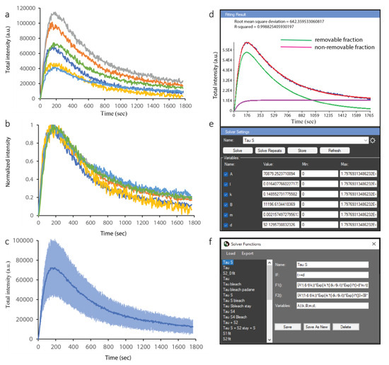 CellTool allows for the straightforward fitting of simple or complex mathematical models to the acquired data. A previously defined and saved model can be selected from the drop-down menu of the fitting interface (Figure 5e), and initial parameters can be specified. The initial parameters are only needed to “nudge” the model optimizer in the right direction, and they may not be accurate at all. The solver will automatically optimize them and provide the best fit. The equation of the loaded model can be edited, or a new model can be defined in a pop-up window (Figure 5f and Supplementary file S1). We fitted a previously developed consecutive reaction chain (CRC) model [16] to the PCNA data. The CRC model can describe protein recruitment to damage as a series of up to three consecutive reactions, a period of residence at the lesion, and a reaction through which the protein is removed from the lesion. Importantly, this model can faithfully describe the kinetics of a factor that is recruited to the lesion through more than one mechanism, as we have previously shown. As is often the case, repair proteins may not dissociate completely from the damage site during the course of the imaging experiment. For example, 30 min time-lapse imaging is sufficient for obtaining the half-times of PCNA recruitment and removal from DNA damage sites, with a small focus still visible at the end. In such cases, the repair proteins kinetics are modeled as the sum of a removable and a non-removable fraction (Figure 5d). We provide a txt. file (Supplementary file S2) with a number of CRC model equations that can be load to the CellTool.