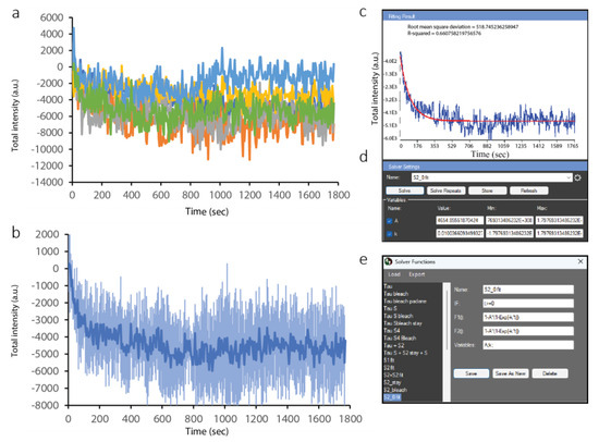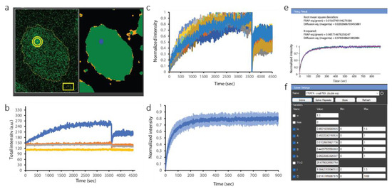 Computationally, this is the difference between the blue curve and the orange curve in Figure 7b. The gray and yellow curves correspond to the EGFP signal inside the nucleus and the out-of-cell background, respectively. The lack of a decrease in the intensity measured for the whole nucleus over the 5000 s time-lapse acquisition imaging demonstrates that negligible bleaching, if any, occurred.