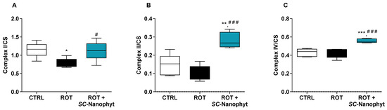 Mitochondrial respiratory failure in the skeletal muscle of patients with PD has been reported [18,19], emphasizing their role in motor symptoms. Thus, the benefits of the oral administration of SC-Nanophytosomes on the skeletal muscle mitochondria were assessed considering the effects on the activity of the individual respiratory complexes I, II (succinate dehydrogenase), and IV (cytochrome c oxidase) in the mitochondria-rich fraction (Figure 1). The activity of these mitochondrial complexes was normalized by the citrate synthase (CS) activity to discard putative differences in the mitochondria content of the samples. Skeletal muscle mitochondria obtained from three experimental groups exhibit similar values of CS activity, namely 134.95 ± 16.05, 137.19 ± 16.45, and 106.30 ± 12.78 for CTRL, ROT, and ROT+SC-Nanophyt groups, respectively.