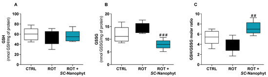 Cytosolic redox state of skeletal muscle tissues, measured by the levels of GSH (A) and GSSG (B) and GSH/GSSG molar ratio (C) of samples of CTRL, ROT and ROT+SC-Nanophyt groups. Error bars represent SEM for n = 5 independent experiments using five animals in each one. Significance was considered when p < 0.05. Versus ROT: ## p ≤ 0.01 and ### p < 0.001.