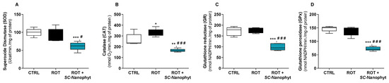 Regarding the activity of SOD, CAT, GR, and GPx enzymes in the cytosolic fraction of the skeletal muscle tissues, data from Figure 3 show that the rotenone-induced rat model of PD only affects the activity of CAT, promoting a significant increase in its activity when compared to the CTRL group. The increased CAT activity in the ROT group suggests that the skeletal muscle cells reply to a cytosolic increase in hydrogen peroxide levels, enhancing the activity of this enzyme. Additionally, the treatment with SC-Nanophytosomes in rats with PD-like pathology strongly impacts the activity of all evaluated antioxidant enzymes. Thus, in the ROT+SC-Nanophyt group, a significant decrease in SOD, CAT, GR, and GPx enzyme activity compared with the CTRL group or the ROT group is detected. Previously, it was shown that the SC-Nanophytosomes have positive brain impacts on the rotenone-induced PD rat model by modulating the activity of antioxidant enzymes in brain cells [16].