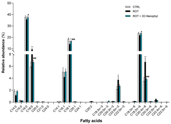 Fatty acid profile of phospholipid extracts obtained from skeletal muscle homogenates of CTRL, ROT and ROT+SC-Nanophyt groups (CTRL: white bars; ROT: black bars; ROT+SC-Nanophyt: blue bars): C14:0 = myristic acid; C15:0 = pentadecanoic acid; C16:0 = palmitic acid; C18:0 = stearic acid; C20:0 = arachidonic acid; C21:0 = heneicosanoic acid; C24:0 = lignoceric acid; C14:1 = myristoleic acid; C16:1 = palmitoleic acid; C18:1 = oleic acid; C20:1 = eicosenoic acid; C24:1 = nervonic acid; C20:2 = eicosadienoic acid; C18:3n−3 = α-linolenic acid; C20:5n−3 = eicosapentaenoic acid (EPA); C20:3n−3 = eicosatrienoate acid; C22:6n−3 = docosahexanoic acid (DHA); C22:5n−3 = docosapentaenoic acid (DPA); C18:3n−6 = γ -linolenic acid; C18:2n−6 = linoleic acid; C20:4n−6 = arachidonic acid (AA); C20:3n−6 = dihomo-γ-linolenic acid (DGLA); C22:5n−6 = docosapentaenoic acid; C22:4n−6 = docosatetraenoate; C22:2n−6 = docosadienoic acid. Error bars represent SEM for n = 5 independent experiments using five animals in each one. *, **, *** Significantly different from the CTRL group, with p ≤ 0.05, p < 0.01 and p < 0.001, respectively. #, ### Significantly different from the ROT group, with p ≤ 0.05 and p < 0.001, respectively.