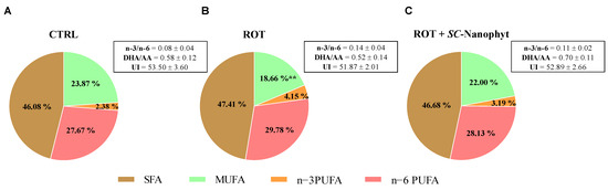 Functional parameters of the fatty acid profile obtained from total lipids obtained from skeletal muscle homogenates of CTRL (A), ROT (B) and ROT+SC-Nanophyt (C) groups. AA—arachidonic acid; DHA—docosahexaenoic acid; SFA—saturated fatty acids; MUFA—monounsaturated fatty acids; PUFA—polyunsaturated fatty acids; UI—unsaturation index. ** Significantly different from the CTRL group, with p < 0.01.