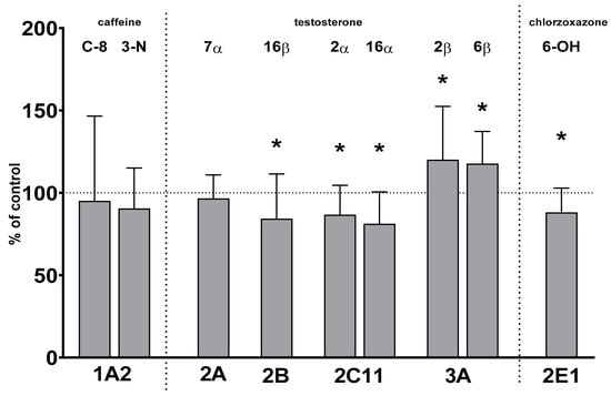 The effect of chronic treatment with lurasidone on the activity of cytochrome P450 enzymes in liver microsomes. The activities of CYP enzymes were measured as the rates of CYP-specific reactions: caffeine 8-hydroxylation and 3-N-demethylation (CYP1A), testosterone 7α- (CYP2A), 16β- (CYP2B), 2α- and 16α- (CYP2C11), and 2β- and 6β- (CYP3A) hydroxylation, and chlorzoxazone 6-hydroxylation (CYP2E1). All results are presented as the mean ± SD (n = 15 rats). Student’s t-test: * p < 0.05 versus respective control. The control values are as follows: 8.73 ± 2.76 pmol/mg protein/min (caffeine 8-hydroxylation); 0.82 ± 0.28 pmol/mg protein/min (caffeine 3-N-demethylation); 211 ± 29 pmol/mg protein/min, 119 ± 38 pmol/mg protein/min, 1.392 ± 0.41 nmol/mg protein/min, 1.605 ± 0.45 nmol/mg protein/min, 136 ± 21 pmol/mg protein/min and 1.297 ± 0.2 nmol/mg protein/min (testosterone 7α-, 16β-, 2α-, 16α-, 2β- and 6β-hydroxylation, respectively); and 2.84 ± 0.35 nmol/mg protein/min (chlorzoxazone 6-hydroxylation).