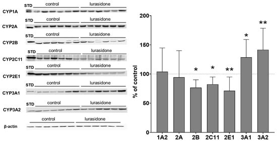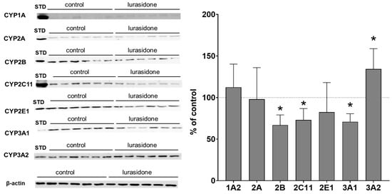 The influence of prolonged treatment with lurasidone on the protein level of CYP1A, CYP2A, CYP2B, CYP2C11, CYP2E1, CYP3A1 and CYP3A2 in the rat liver microsomes. Microsomes (10 μg protein per lane) were analyzed by Western immunoblotting. The results are demonstrated as representative blots from six (for the control and for lurasidone treatment) rats per group. The data are shown as the mean ± SD (n = 12 rats). Student’s t-test: * p < 0.05, ** p < 0.01 versus respective control. STD: standard.