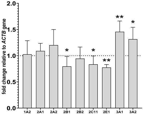 The influence of two-week treatment with lurasidone on the mRNA levels of CYP1A2, CYP2A1, CYP2A2, CYP2B1, CYP2B2, CYP2C11, CYP3A1, CYP3A2 and CYP2E1 genes in the liver. The results are expressed as the fold-change in relation to the reference gene ACTB. All the values denote the mean fold-change calculated by the comparative delta-delta Ct method for the control and lurasidone-treated rats. All values are expressed as means ± SD (n = 10 rats). Student’s t-test: * p < 0.05, ** p < 0.01 compared to the control group.