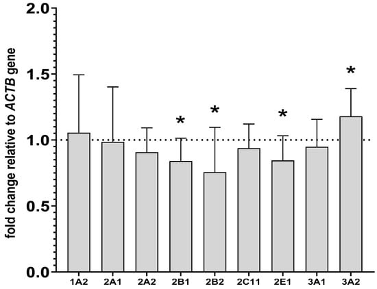 Total RNA Mini kit (A&A Biotechnology, Gdynia, Poland) was used for isolation of the RNA from frozen liver or lymphocyte cells following the producer’s protocol. The quality and concentration of the RNA were estimated spectrophotometrically by a Synergy/HTX multi-mode reader (BioTek, Winoosk, VT, USA), and A260/280 ratios were between 1.8 and 2.0 in all the tested samples. Reverse transcription was conducted using a High Capacity cDNA Reverse Transcription Kit (Life Technologies, Carlsbad, CA, USA) in agreement with the producer’s protocol. Real-time PCR analysis was conducted in duplicate with TaqMan type probes and primers, TaqMan Expression Master Mix (Life Technologies, Carlsbad, CA, USA) [] and Bio-Rad CFX96 PCR system (Bio-Rad, Hercules, CA, USA). The housekeeping genes (ACTB, GAPDH and HPRT) were quantified to references. The abundance of RNA was calculated as 2-delta Ct, as described previously [].