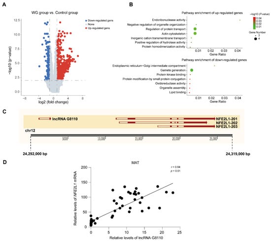The identification of lncRNA G8110 and the prediction of its regulatory target genes. (A) Volcano plot of differentially expressed genes. Positive values indicate up-regulation; negative values indicate down-regulation. The x-axis represents the log2 scale of fold change. A significant difference in expression is indicated by the y-axis, which displays the −log10 scale of adjusted p values. (B) GO and KEGG pathway analysis of the target genes of lncRNAs with significant differential expression. Only the pathways with a p < 0.05 after correction are listed. (C) A schematic diagram of the positions of NFE2L1 and lncRNA G8110 on chromosome 12. (D) Pearson’s correlation analysis between NFE2L1 and lncRNA G8110 mRNA expression levels in the MAT of 48 Bama pigs. Data are expressed as the mean ± SEM.