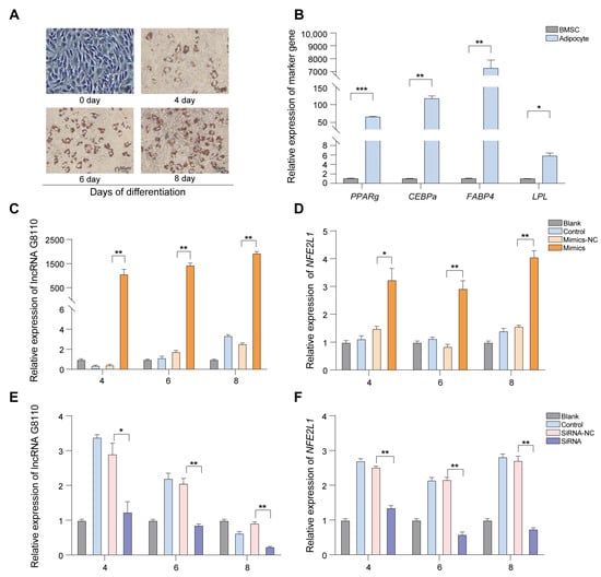 Effect of overexpression and knockdown of lncRNA G8110 on NFE2L1. (A) Establishment of a BMSC adipogenic differentiation model. Oil-red O staining of Bama pig BMSCs at days 4, 6, and 8 of adipogenic induction into adipose cells. Scale bar: 50 μm. (B) To confirm the successful differentiation of the BMSCs into adipose cells, RT-qPCR was used to detect the expression of adipogenic marker genes in the BMSCs at 8 days of adipogenic differentiation. (C) Measurement of the lncRNA G8110 overexpression level at various time points after the adipogenic differentiation of the BMSCs. (D) Expression levels of NFE2L1 mRNA in BMSCs under the overexpression of lncRNA G8110 at various time points after adipogenic differentiation. (E) Measurement of the expression levels of lncRNA G8110 under siRNA-mediated knockdown at various time points after the adipogenic differentiation of the BMSCs. (F) Measurement of NFE2L1 mRNA expression under lncRNA G8110 knockdown at various time points after the adipogenic differentiation of the BMSCs. Note: Expression levels were standardized to the expression level of the gene before the induction of differentiation. Data are expressed as the mean ± SEM; * p < 0.05, ** p < 0.01, *** p < 0.001.
