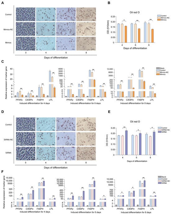 For the lncRNA G8110 overexpression and knockdown assays, cells were seeded in 24-well plates. At 80–90% confluence, the lncRNA G8110 plasmid (the full-length sequence of lncRNA G8110 was inserted into the plasmid), the pEGFP-N1 empty plasmid, a small interfering RNA (siRNA), and a siRNA-negative control were added (Table S5). For the overexpression of lncRNA, cells were divided into BMSCs (Blank), a normal adipogenic differentiation group (Control), an empty vector group (Mimics-NC), and an overexpression group (Mimics). For the interference experiments, cells were divided into BMSCs (Blank), a normal adipogenic differentiation group (Control), a negative control group (siRNA-NC), and a knockdown group (siRNAs). Cells were transfected using Lipofectamine 3000 (Invitrogen, Carlsbad, CA, USA) following the manufacturer’s instructions (with a vector concentration of 500 ng per well). After transfection for 24 h, the culture medium was removed; adipogenic differentiation medium A (Cyagen, Guangzhou, China) was added for 2 days and then replaced with adipogenic induction maintenance medium B (Cyagen) for 2 days. After two cycles (8 days in total), adipose cells containing large, round lipid droplets had appeared. The cells were differentiated for 4, 6, and 8 days, collected, and stored at −80 °C for further analysis.