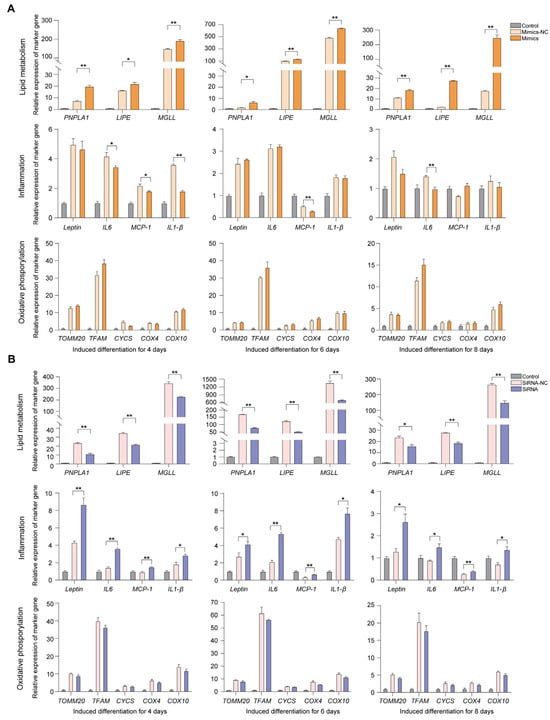 LncRNA G8110 promotes lipid metabolism in adipose tissue and affects biological processes. (A,B) Measurement of the expression levels of genes related to lipid metabolism, cellular inflammation, and mitochondria in BMSCs with an overexpression of G8110 (A) or knockdown of G8110 (B) at various time points after adipogenic differentiation. Note: Expression levels were standardized to the expression level of the gene before cell differentiation. Data are expressed as the mean ± SEM; * p < 0.05; ** p < 0.01.