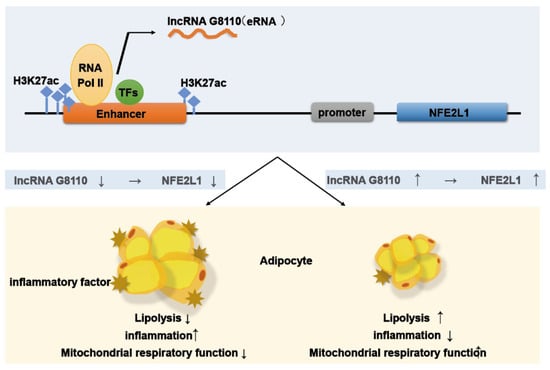 Previous studies have revealed that NFE2L1 deficiency is associated with decreased lipolysis ability, cellular inflammation, and the mitochondrial respiratory function of adipose tissue [,,]. To examine the effects of lncRNA G8110 on these functions of adipose cells, we used RT-qPCR to measure the expression of representative lipolysis genes, cellular inflammation-related genes, and mitochondrial marker genes in cells under lncRNA G8110 overexpression or interference.
