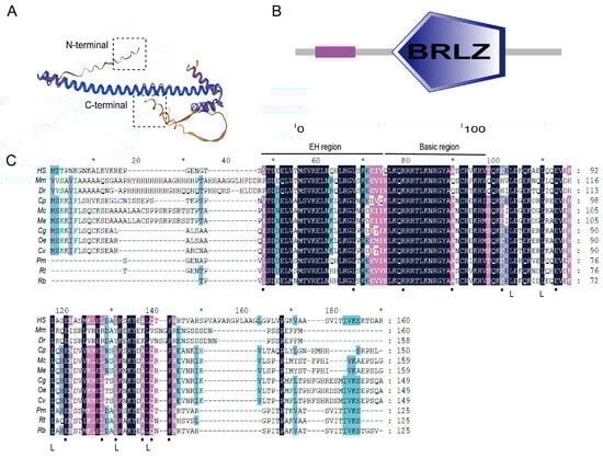 McMafF_G_K amino acid structure prediction. Note: (A): McMafF_G_K amino acid three-dimensional structure. (B): Architecture analysis of conserved domains in McMafF_G_K using SMART. A conserved BRLZ domain was shown. (C): Multiple sequence alignment of McMafF_G_K. HS: Homo sapiens MafG sp|O15525.1|; Mm: Mus musculus Maf NP_001020748.2; Dr: Danio rerio Maf AAH65941.1; Cp: Cristaria plicata MafK ATW64756.1; Mc: Mytilus coruscus MafF_G_K CAC5373282.1; Me: Mytilus edulis MAFF_G_K CAG2191884.1; Cg: Crassostrea gigas MafK XP_011432122.1; Oe: Ostrea edulis MafK-like XP_048760401.2; Cv: Crassostrea virginica MafK-like XP_022315636.1; Pm: Pecten maximus MafK-like XP_033732961.1; Rt: Rana temporaria MafF XP_040215466.1; Rb: Rhinatrema bivittatum MafF XP_029446021. Identical amino acids are shown in black, while similar amino acids are shown in pink and blue; Circles denote amino acids conserved among small Maf; Heptad repeats of L indicate the leucine zippers.