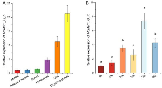 The distribution profile of McMafF_G_K transcripts in various tissues was investigated using a quantitative real-time PCR (qRT-PCR) assay. Figure 2A demonstrated that the expression level of McMafF_G_K mRNA was observed to be highest in the digestive glands, followed by the gills and hemocytes, with the lowest expression detected in the mantle. Furthermore, the transcriptional response of McMafF_G_K to exposure to Bap was also examined, as depicted in Figure 2B. Following stimulation with Bap, the transcriptional expression of McMafF_G_K exhibited a significant up-regulation starting from 24 h post-stimulus (hps), ultimately peaking at 72 hps. Subsequently, although there was a decrease in McMafF_G_K transcription, it remained significantly higher than the control.