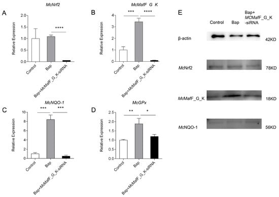 Following a 6 h exposure to Bap, the mRNA expression levels of McMafF_G_K, McNrf2, McNQO-1, and McGPx were significantly up-regulated compared to the control group. Subsequently, upon knockout of McMafF_G_K, there was a noticeable down-regulation in the expression of McMafF_G_K mRNA when compared to the Bap group, suggesting an effective interference effect of McMafF_G_K-siRNA (Figure 3E). The expression levels of McNrf2, McNQO-1, and McGPx mRNA also showed a significant downward trend once siRNA was added (Figure 3A,C,D). At the protein level, both McNrf2, McNQO-1 and McMafF_G_K exhibited an up-regulation trend in response to Bap-induced stress, and their expression levels decreased after McMafF_G_K-siRNA treatment, mirroring the changes observed at the mRNA level (Figure 3E).