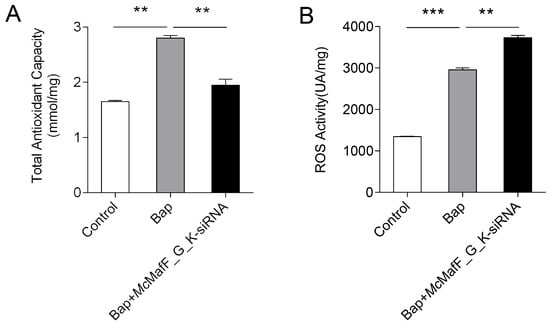 The activity of ROS and T-AOC in digestive gland cells after McMafF_G_K-siRNA interference. Note: (A): The activity of ROS in digestive gland cells after McMafF_G_K-siRNA interference. (B): The activity of T-AOC in digestive gland cells after McMafF_G_K-siRNA interference. The statistical analysis employed one-way ANOVA. The vertical bars represent the mean ± SD. (n = 3). ** p < 0.01, and *** p < 0.001 compared with the DMSO control group.