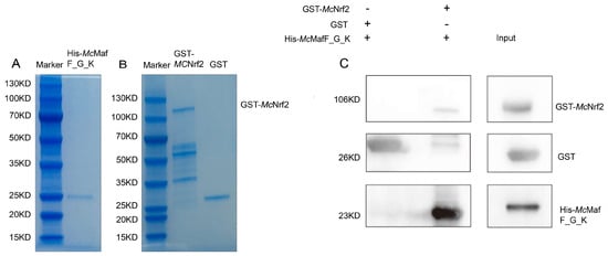 To validate the interaction between McNrf2 and McMafF_G_K, a GST pull-down assay was conducted. The recombinant His-McMafF_G_K protein was expressed using a prokaryotic expression method and subsequently purified using a Ni-affinity resin (Huiyan Bio, Wuhan, China). The size of the purified His-McMafF_G_K protein was estimated to be approximately 23 kDa based on the analysis performed on an SDS-PAGE gel (Figure 5A). Similarly, the recombinant GST-McNrf2 protein was expressed using the prokaryotic system and purified using a glutathione affinity resin (Huiyan Bio, Wuhan, China). The size of the resulting protein band was observed to be around 106 kDa on the SDS-PAGE gel (Figure 5B). In contrast, the purified GST protein displayed a size of approximately 26 kDa (Figure 5B). Subsequently, the His-McMafF_G_K protein was incubated with the prey protein, and a Western blot analysis was conducted using anti-GST and anti-His antibodies. The experimental group exhibited distinct bands at 23 kDa (His) and 106 kDa (GST), providing clear evidence of the specific interaction between McNrf2 and McMafF_G_K. In contrast, the control group only displayed a single band at 26 kDa (GST) (Figure 5C).