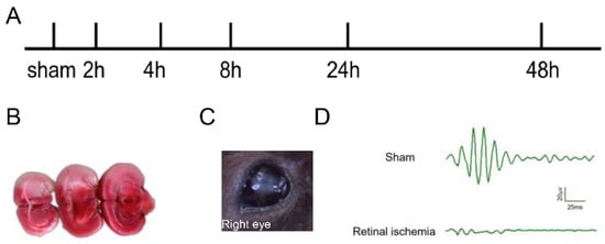Stroke is currently the main factor affecting human health and quality of life, with ischemic stroke accounting for approximately 87% of all stroke-related events [,,]. In clinical diagnosis and treatment, it has been found that some patients with acute ischemic stroke often experience ipsilateral retinal ischemia, which often leads to acute painless loss of monocular vision [,]. The main anatomical reason is that the ophthalmic artery and internal carotid artery are adjacent to each other. Moreover, in animal experiments, it was found that the successful establishment of a model of middle cerebral artery occlusion can also be accompanied by ischemia of the ipsilateral retina [,], leading to the phenomenon of “whitening” of the ipsilateral eyeball []. Insufficient blood supply to the ophthalmic artery can cause an infarction of the retinal ganglion cells (RGCs) and optic nerve [,], causing visual disturbances and blindness [,,].