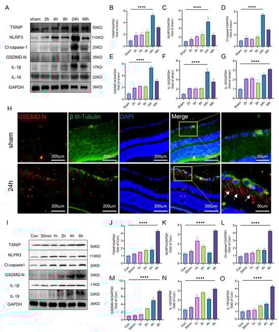 Time-Course of TXNIP/NLRP3-mediated pyroptosis. (A) TXNIP/NLRP3-mediated pyroptosis expression of the ischemic retina in vivo. The blots are representative of other replicates in those groups. (B–G) Quantification of result in panel (A) (n = 6 for each group). (H) Representative photographs of GSDMD and Neuronal β-III Tubulin co-staining of frozen sections of retina tissue at 24 h after MCAO-induced right retinal ischemia (white arrows show axons that undergo pyroptosis). (I) Representative immunoblot of TXNIP/NLRP3-mediated pyroptosis expression in cultured primary RGC after OGD in different times; Con: control group, RGCs cultured in normal Neurobasal. (J–O) Quantification of result in panel I (n = 3 for each group). Data are expressed as the mean ± SD. For panel (B–G,J–O): **** p < 0.0001 by one-way-ANOVA analysis. All data are representative of three independent experiments.