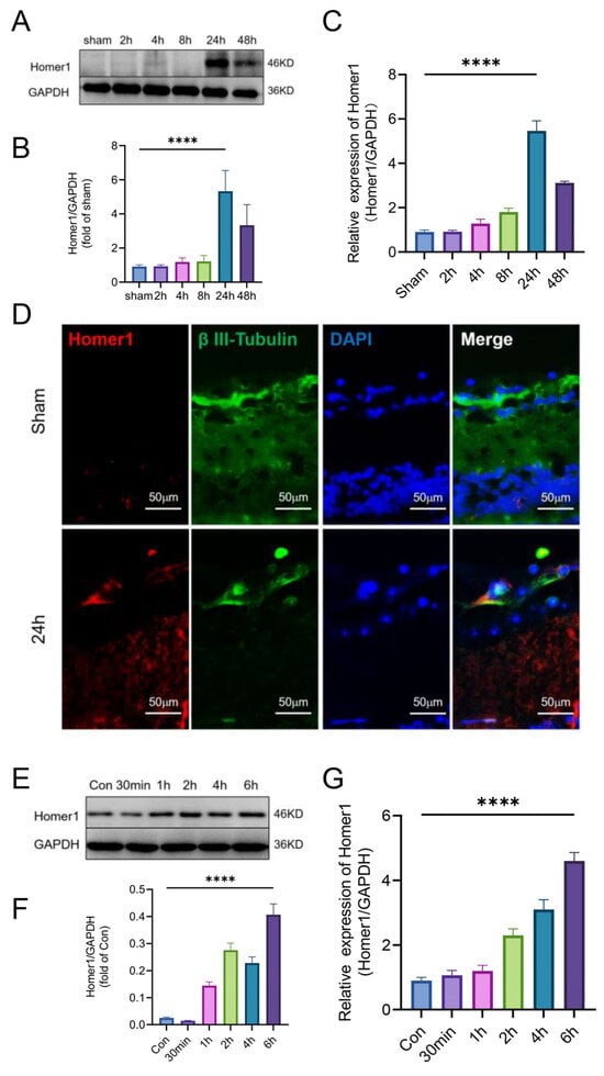 Protein and mRNA expression levels of Homer1 after MCAO model-induced right retinal ischemia. (A) Homer1 protein expression of the ischemic retina in vivo. The blots are representative of other replicates in those groups. (B) Quantification of result in panel (A) (n = 6 for each group). (C) Homer1 mRNA expression in vivo after MCAO model-induced right retinal ischemia (n = 6 for each group). (D) Representative photographs of Homer1 and Neuronal β-III Tubulin co-staining of frozen sections of the retina at 24 h after MCAO-induced right retinal ischemia. (E) Protein expression of Homer1 in primary RGCs after OGD. (F) Quantification of result in panel (E) (n = 3 for each group). (G) mRNA level of Homer1 (n = 3 for each group). Data are expressed as the mean ± SD. For panel (B,C,F,G): **** p < 0.0001 by one-way-ANOVA analysis. All data are representative of three independent experiments.