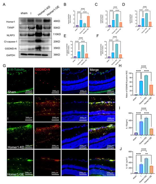 Overexpression of Homer1 alleviated TXNIP/NLRP3-mediated pyroptosis in vivo. (A) Effects of Homer1-OE and Homer1-KD on the expression level of TXNIP/NLRP3-mediated pyroptosis-related proteins were examined by Western blot in vivo at 24 h after retinal ischemia. (B–F) Quantification of result in panel (A) (n = 6 for each group). (G) Representative photographs of GSDMD-positive RGC in each group. (H) Quantification of result in panel (G) (n = 6 for each group). (I) Expression of IL-18 (n = 6 for each group). (J) Expression of IL-1β (n = 6 for each group). Data are expressed as the mean ± SD. For panel (B–F,H–J): ** p < 0.01, *** p < 0.001, and **** p < 0.0001 by one-way-ANOVA analysis. All data are representative of three independent experiments.