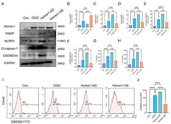 In addition, RGCs were transduced through lentivirus, resulting in Homer1-OE and Homer1-KD. WB results showed that Homer1-OE significantly decreased the expression of the protein of the TXNIP/NLRP3 signal axis (Figure 5A–F). ELISA displayed that Homer1-OE inhibited the release of IL-18 and IL-1β (Figure 5G,H). In addition, flow cytometry results indicated that Homer1-OE reduced the proportion of GSDMD-positive RGCs (Figure 5I,J). At the same time, Homer1-KD aggravated the expression of characteristic proteins of the pyroptosis signaling pathway and the release of inflammatory factors. These data illustrated that Homer1 may play a protective role by inhibiting the pathological process of TXNIP/NLRP3-mediated pyroptosis.