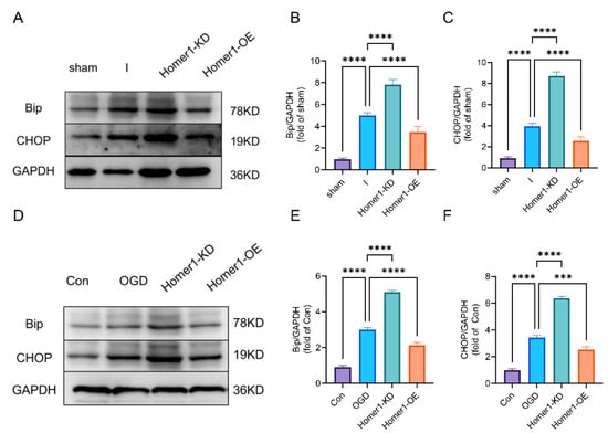 Overexpression of Homer1-alleviated endoplasmic reticulum stress. (A) Expression levels of Bip and CHOP protein were tested by Western blotting measurement in vivo at 24 h after retinal ischemia. (B,C) Quantification of result in panel (A) (n = 6 for each group). (D) Expression levels of Bip and CHOP protein were tested by Western blot measurement in vitro at 6 h after OGD. (E,F) Quantification of result in panel (C) (n = 3 for each group). Data are expressed as the mean ± SD. For panel (B,C,E,F): *** p < 0.001 and **** p < 0.0001 by one-way-ANOVA analysis. All data are representative of three independent experiments.