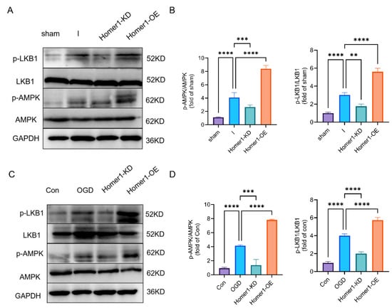 Effects of Home1-OE and Homer-KD on upstream kinase LKB1 and AMPK signaling. (A) WB was performed to examine the effects of Homer1-OE and Homer1-KD on upstream kinase LKB1 and AMPK signaling protein expression in vivo at 24 h after retinal ischemia. (B) Quantification of result in panel (A) (n = 6 for each group). (C) WB was performed to examine the effects of Homer1-OE and Homer1-KD on upstream kinase LKB1 and AMPK signaling protein expression in vitro at 6 h after OGD. (D) Quantification of result in panel (C) (n = 3 for each group). Data are expressed as the mean ± SD. For panel (B,D): ** p < 0.01, *** p < 0.001 and **** p < 0.0001 by one-way-ANOVA analysis. All data are representative of three independent experiments.