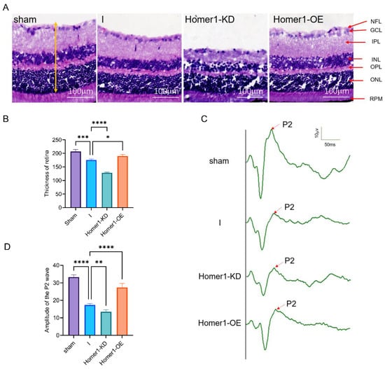 Overexpression of Homer1-attenuated ischemic injury of the retina. (A) Hematoxylin and eosin staining of retinal cross-sections showed the decreased thickness of retinal tissue (marked by the yellow arrow) 24 h after MCAO model-induced right retinal ischemia, and this effect was markedly inhibited with Homer1-OE treatment. Representative images from the sham group, I group, Homer1-OE group, and Homer1-KD group. (B) Retinal tissue thickness was assessed by H&E staining and Image J analysis (n = 6 for each group). (C) Representative Flash visual–evoked potential (FVEP) of right eye profile in each group. (D) Quantification of the amplitude of the P2 wave in panel (C) (n = 6 for each group). Data are expressed as the mean ± SD. For panel (B,D): * p < 0.05, ** p < 0.01, *** p < 0.001, **** p < 0.0001 by one-way-ANOVA analysis. All data are representative of three independent experiments. NFL: nerve fiber layer; GCL: ganglion cell layer; IPL: inner plexiform layer; INL: inner nuclear layer; OPL: outer plexiform layer; ONL: outer nuclear layer; RPE: retinal pigment epithelium.