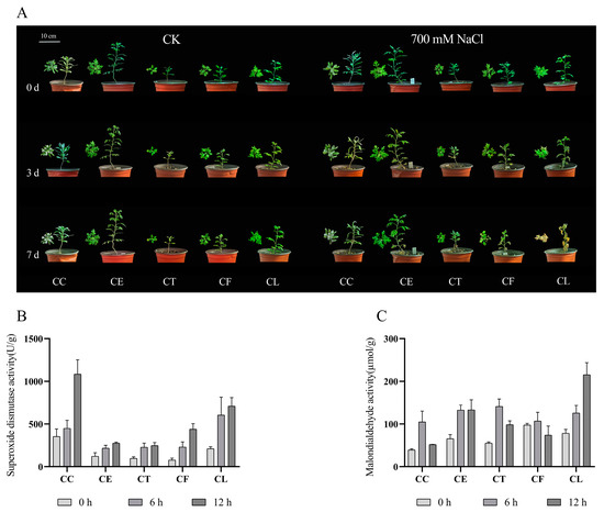 The effect of 700 mM NaCl exposure on the growth and enzymatic antioxidant activities of Cr. chinense (CC), C. lavandulifolium (CL), and three hybrids (CE, CT, and CF): (A) phenotypic differences, (B) SOD, (C) MDA. Data are means of three replicates and follow normal distribution.