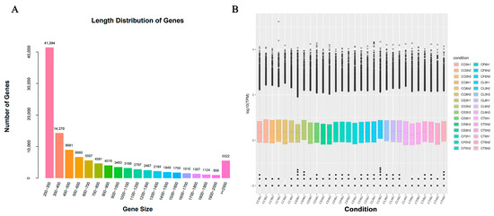 Sequencing data and differentially expressed gene (DEG) results: (A) length distribution of genes, (B) FPKM box diagram of all tested samples.