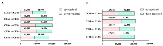The number of upregulated and downregulated DEGs in all comparison combinations: (A) The statistics results of DEGs in comparison of 6h vs 0h. (B) The statistics results of DEGs in comparison of 6h vs 6h.