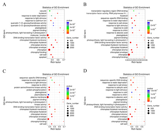 Enrichment analysis of the GO annotation of DEGs in Cr. chinense, C. lavandulifolium, and hybrids: (A) CC6h_vs_CL6h, (B) CE6h_vs_CL6h, (C) CT6h_vs_CL6h, (D) CF6h_vs_CL6h.