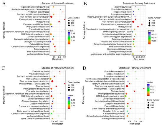 Enrichment analysis of the KEGG pathway of DEGs in Cr. chinense, C. lavandulifolium, and hybrids: (A) CC6h_vs_CL6h, (B) CE6h_vs_CL6h, (C) CT6h_vs_CL6h, (D) CF6h_vs_CL6h.