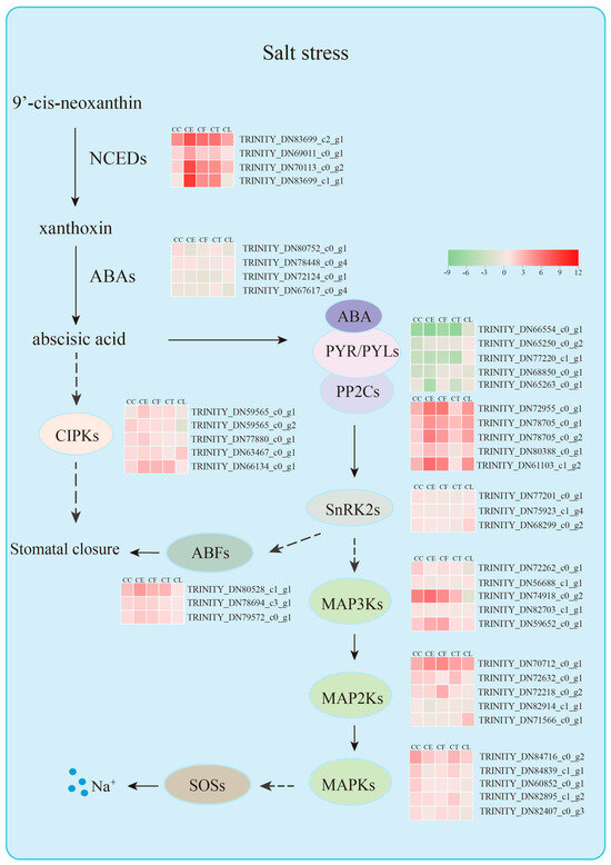 Tissue-specific expression patterns of candidate genes could provide better knowledge of the gene functions in different plant materials. The genes TRINITY_DN66554_c0_g1 and TRINITY_DN83699_c2_g1 showed significant expression levels the in leaves, shoots, and roots, indicating that the carotenoid pathway was activated to synthesize the endogenous ABA that positively regulated salt stress in Cr. chinense and hybrids. Two highly expressed genes in the hybrids, TRINITY_DN80388_c0_g1 and TRINITY_DN61103_c1_g2, revealed salt-tolerant mechanisms similar to those of Cr. chinense. Collectively, these findings indicate that, under salt stress, the hybrids employed the same salt-tolerant mechanisms as Cr. chinense, with the ABA signaling pathway playing a significant role. Based on the hub genes and other potential associated genes screened in each module, a hypothetical model is proposed to explain the mechanism of Cr. chinense under salt stress and analyze the differential expression of the gene family in related pathways (Figure 10). However, further studies are required to validate the definite roles of the genes and the potential connections between the signaling pathways.