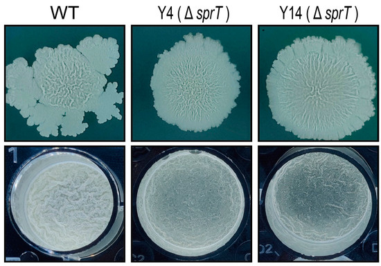 In a previous piece of work, we screened the TnYLB-1 transposon library of B. velezensis FZB42 [21] and noticed that the insertional mutant Y4 has a slightly different colony morphology (Figure 1), indicating that Y4 may be affected in biofilm formation. We examined the pellicle formation of Y4 in LB medium. The result showed that, after 34 h incubation, Y4 formed a less wrinkled pellicle than the wild-type FZB42. This confirmed that Y4 has a defected ability of forming biofilm. We analyzed the position of TnYLB-1 insertion and found it inserted in the sprT gene (Figure 2A). Since we were unable to transform a plasmid for sprT complementation in Y4, we independently constructed a new mutant by knocking out sprT using the homologous recombination method to avoid the possibility that other point mutations during transposition caused the phenotype change in Y14. The generated knockout strain was named Y14 and examined for its ability to form biofilm. We found that Y14 displayed a similar biofilm result to Y4 at either a solid–gas interface or a liquid–gas interface. These results confirmed that sprT should be responsible for the biofilm defects of Y4 and Y14.