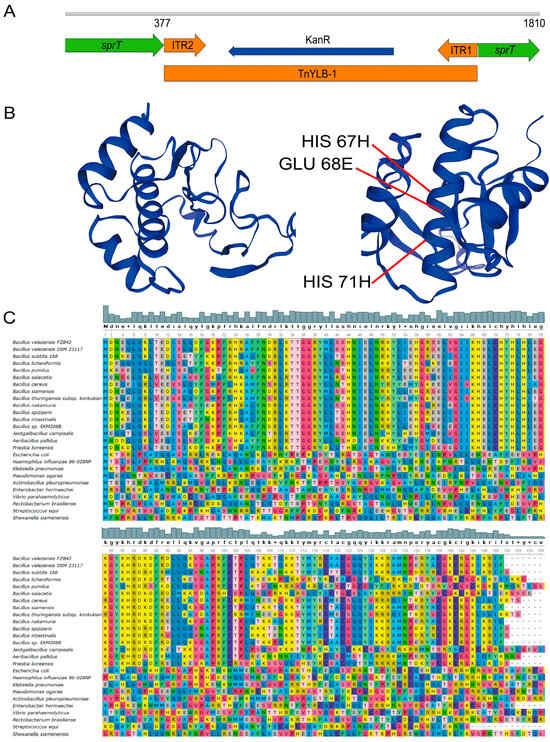 The sequence alignment analysis showed that the SprT protein sequence was conserved in the Bacillus species, and especially highly conserved at 67H, 68E, and 71H but less conserved in other phylogenetically distant species (Table S2, Figure 2C). This indicates that the function of sprT may only be specific to the Bacillus species.