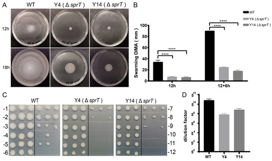 Motility and sporulation are closely linked to biofilm formation in Bacillus. To test whether sprT also affects the motility of FZB42, we examined their swarming ability on 0.5% LB solid medium. The mean diameter of colonies of the FZB42 wild type was 34.25 mm 12 h after incubation, while the mean diameters of Y4 and Y14 were 7.43 mm and 6.43 mm, respectively (Figure 3A,B), whereby both of which were significantly smaller than that of the wild type. When the FZB42 wild-type colonies reached 90 mm in diameter after 18 h, the mean diameters of Y4 and Y14 were 24.6 mm and 17.8 mm, respectively (Figure 3A,B). They were still smaller than those of the wild type. These results indicated that deletion of sprT reduced the swarming ability of FZB42.